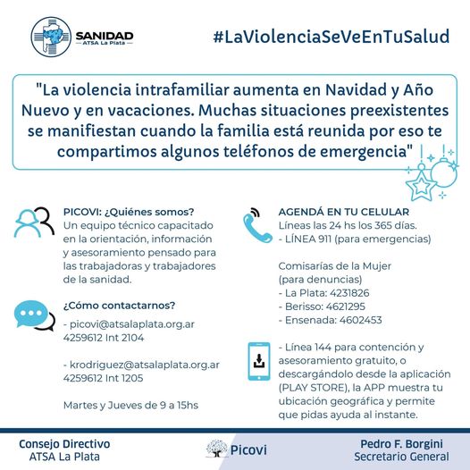 Desde la Secretaria de la Mujer y el Programa Integral Contra las Violencias (PiCoVi), les recordamos los contactos de emergencia. Impulsemos la construcción de un entorno saludable y disfrutemos de los encuentros con la familia, amigxs, compañerxs sin maltratos.